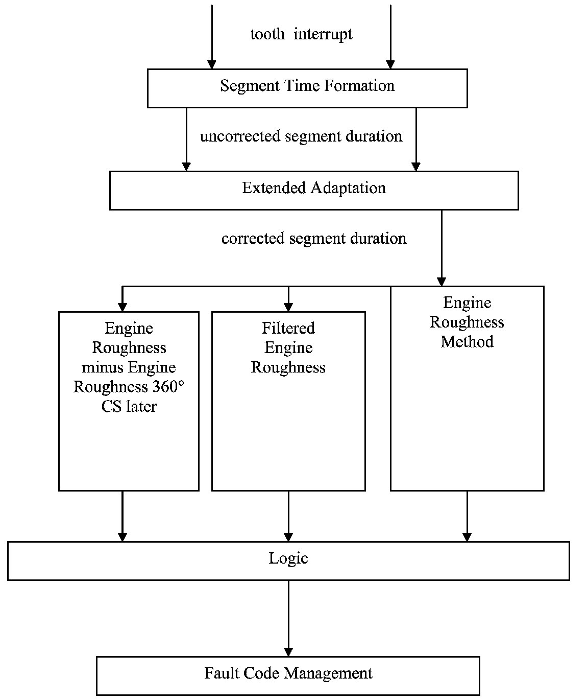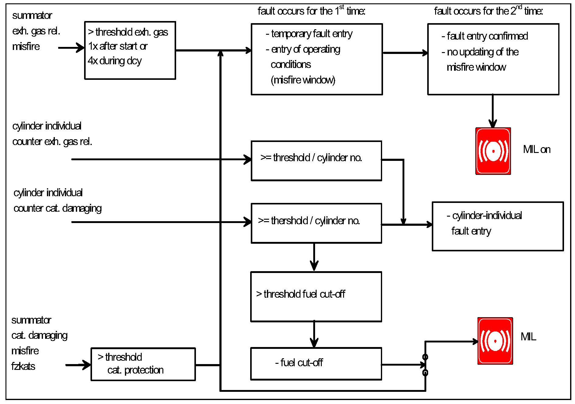 The misfire detection system consists of various sub function, which together guarantee a complete detection of all misfires. Common to all methods is the evaluation of segment durations, which are corrected by means of an adaptation. The misfire detected by each of the individual methods are logically OR'd together and then further processed in the fault code management system. The fault code management system determines, among others, when the MIL is to be triggered.