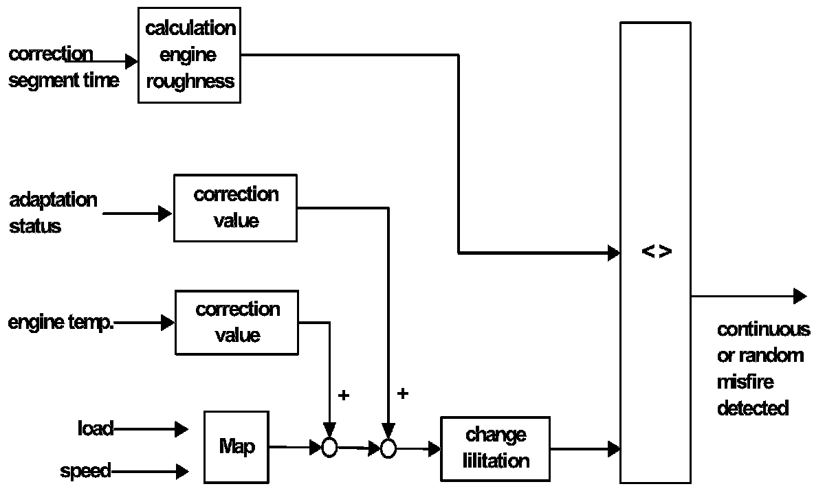 Engine roughness is compared to a specific load / speed dependant threshold. If the threshold is exceeded misfire is detected.