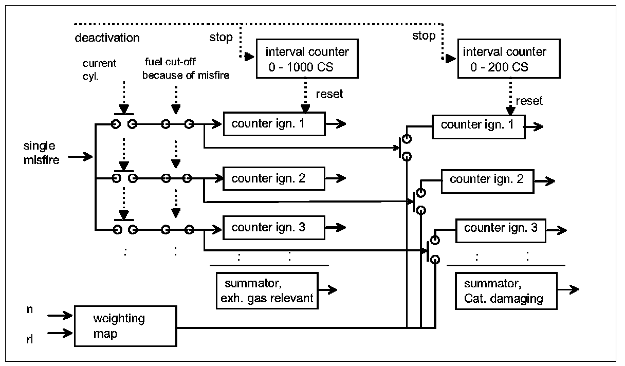 During the fault setting a distinction is made on whether it is an exhaust gas relevant fault (after start or during a driving cycle) or a catalyst damaging fault. Also, an identification of the misfiring cylinder is conducted. With catalyst damaging misfires it is possible to switch off the injector of the affected cylinder to protect the catalyst (up to a maximum of two cylinders). If more than one cylinder misses, then in addition to the cylinder specific fault entry, an additional entry for "multiple misfiring" is set.
