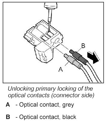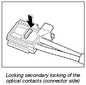 The LWL and the plug connections must not come into contact with fluids such as water, creeping compound, preservative, anti-freeze protection, cleaning agent. They will impair the MOST system function or cause complete system failure. Even plug connectors with plugged-in protective caps must not come into contact with the fluids listed.
