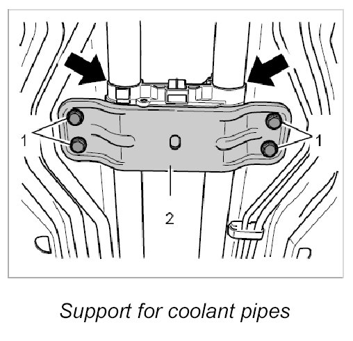 5. Fit coolant pipes in centre tunnel. Secure sheetmetal holder. - Tightening torque: 65 Nm (48 ftlb.)