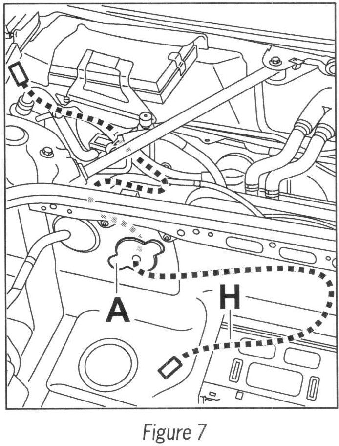 5.3.3 Route GPS antenna line --> Figure 7 -H- as follows and fix in place: Navigation unit installation position -> through rubber grommet -> along wire harness -> right plenum panel