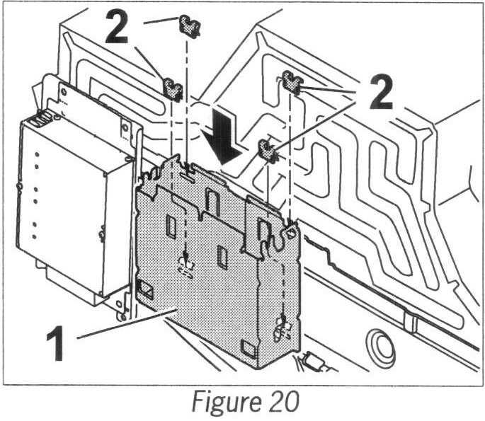 8.3.2 Position retaining frame for the navigation unit on the body, push it into the four holders --> Figure 20 -arrow- and check that it is seated securely by pulling up on the retaining frame.