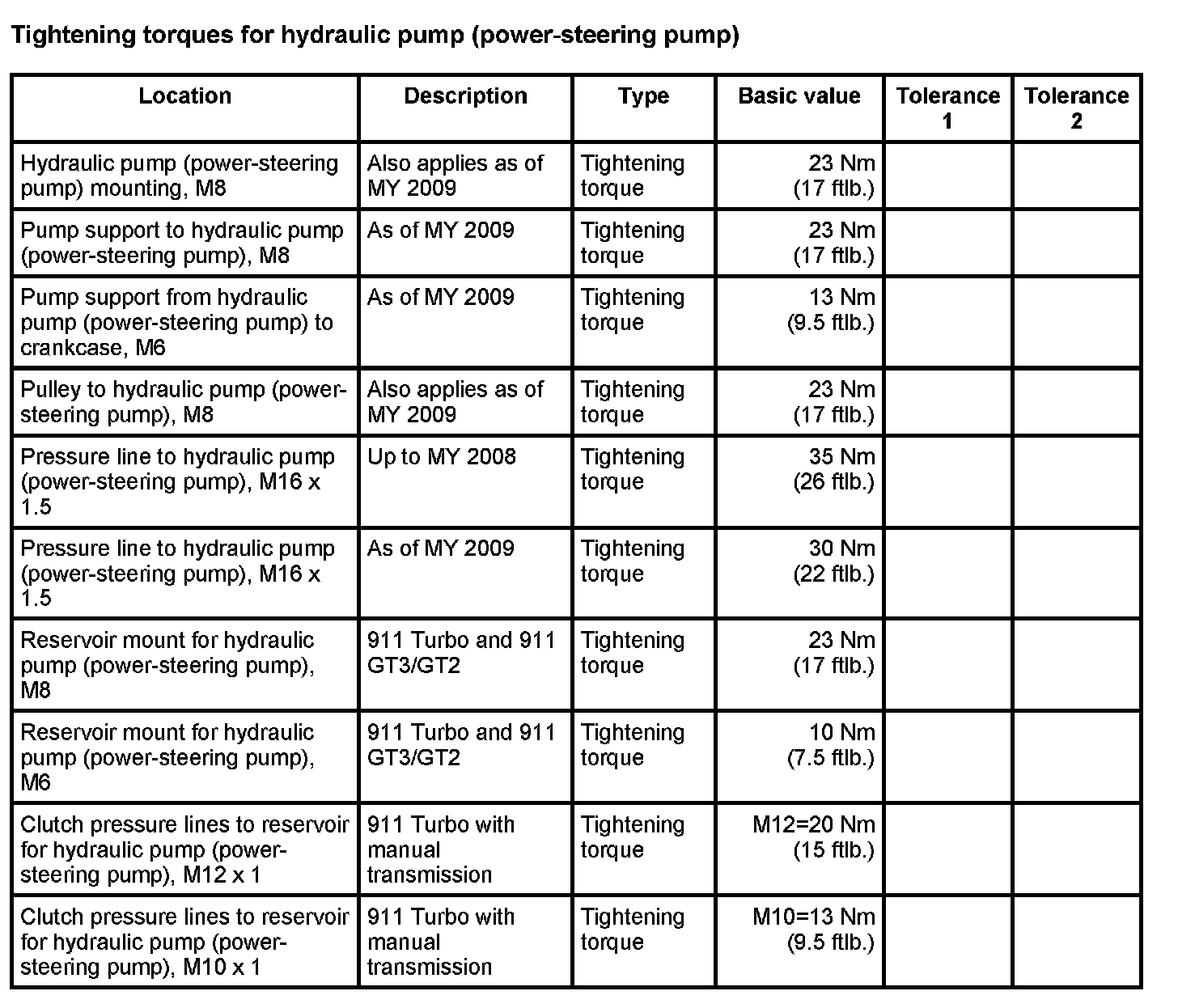 Tightening torques for