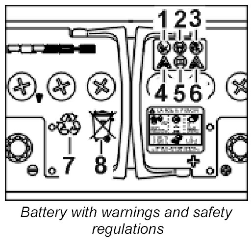 - Danger of injury and risk of damage to materials coming into contact with battery acid.