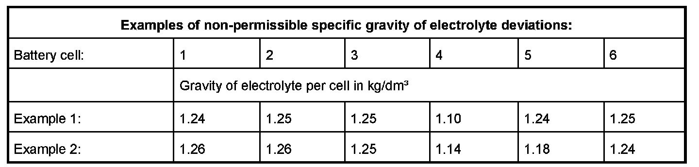 The measured values for the gravity of electrolyte of the individual battery cells should not deviate by more than 0.03 kg/dm� from each other.