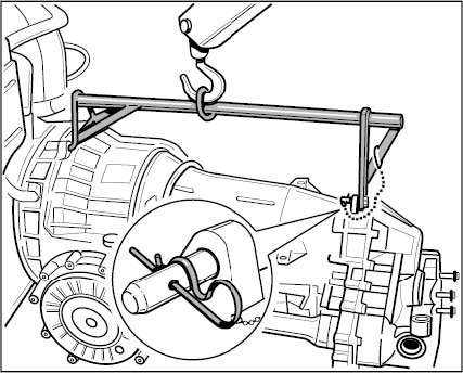 3. Fit holder 96740 on transmission, secure with cotter pin and suspend transmission on workshop crane.