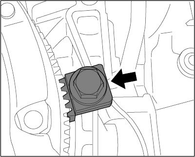 When loosening the clutch pressure plate, ensure that the stop on the adjustment mechanism -arrow- is detached from the housing. The stop must dip loosely into the housing as far as the block. Press the stop towards the flywheel, if necessary.