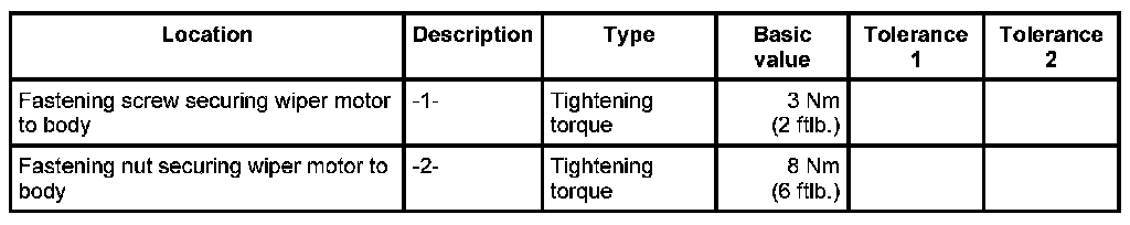 3. Secure the wiper motor with the fastening screw -1- and fastening nuts -2-. - Tightening torque: 3 Nm (2 ftlb.). - Tightening torque: 8 Nm (6 ftlb.)