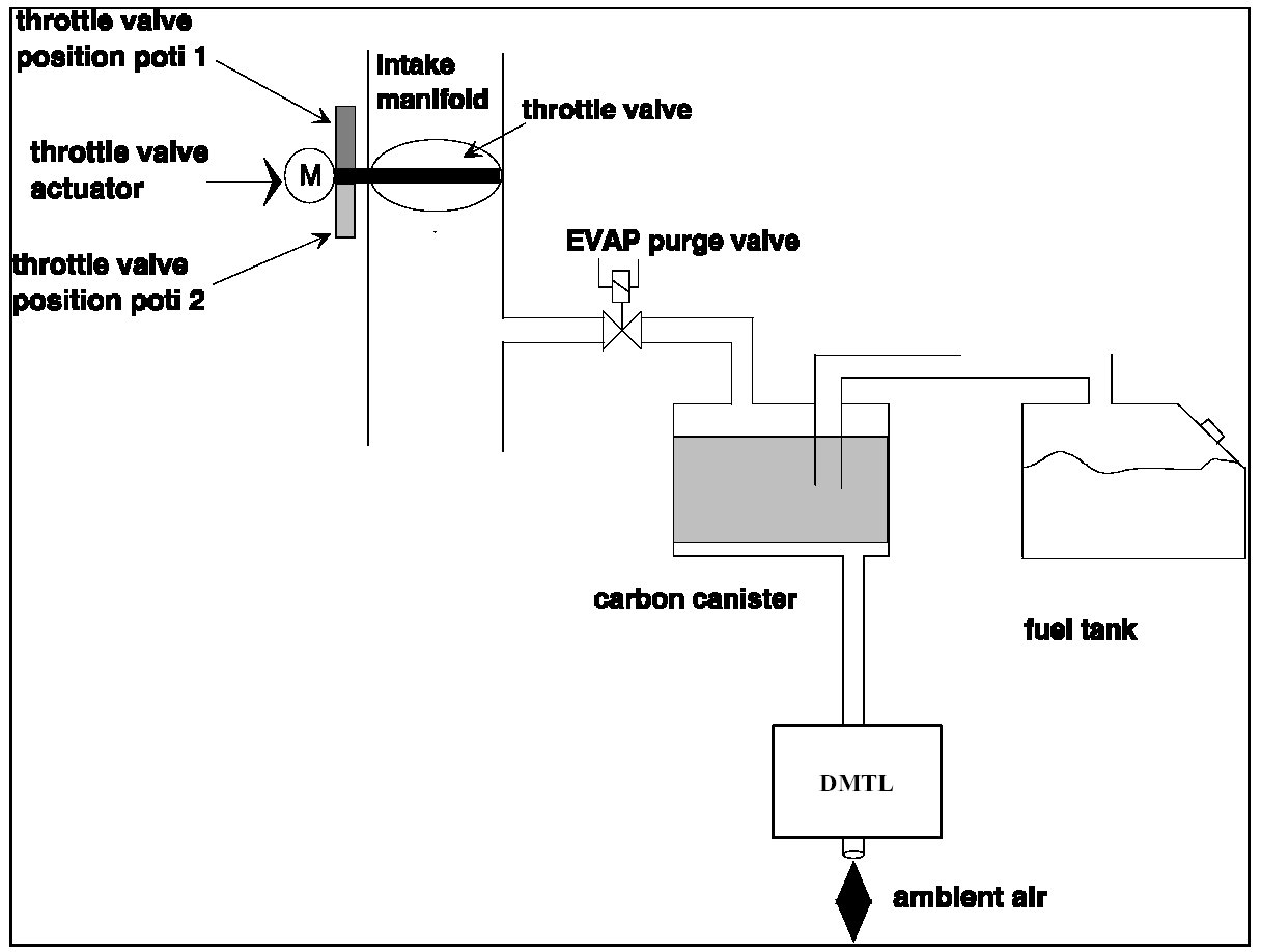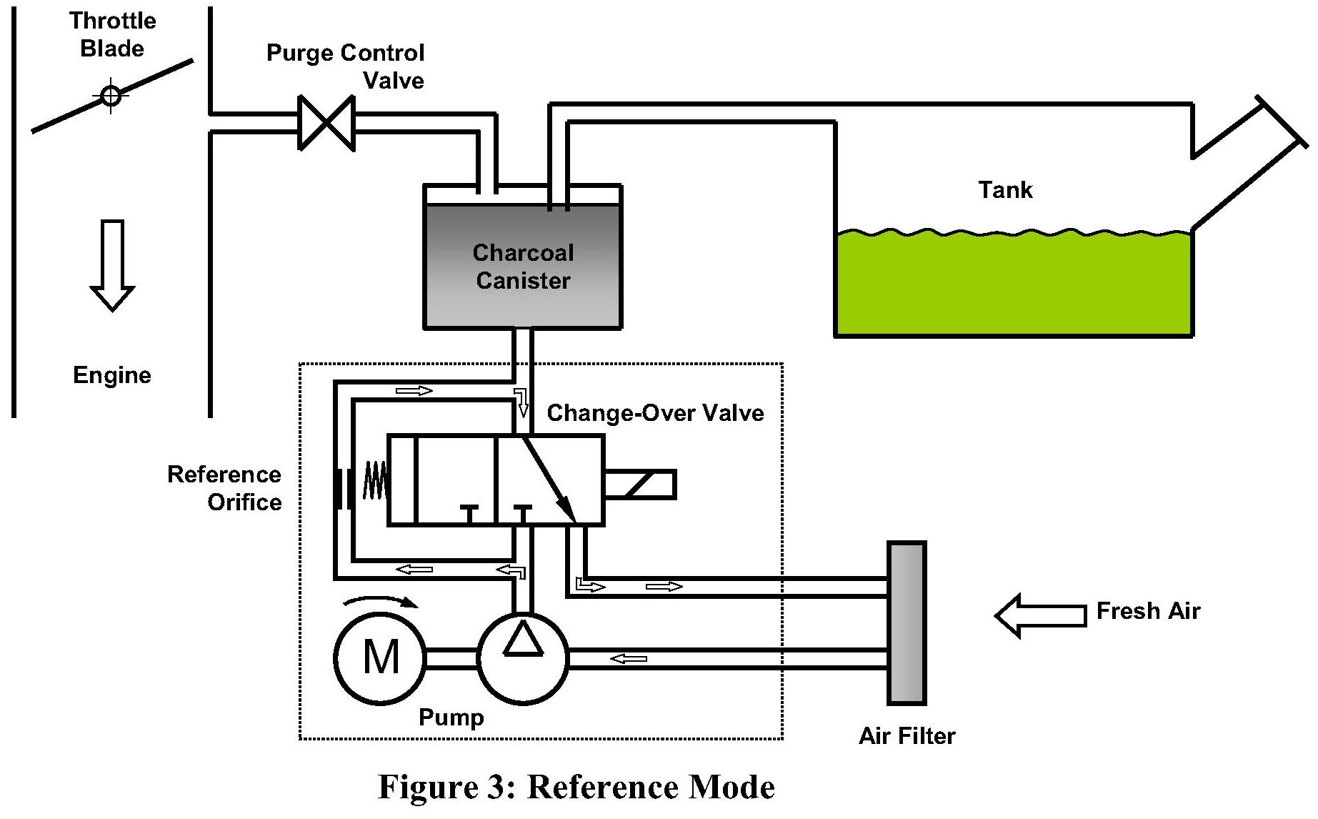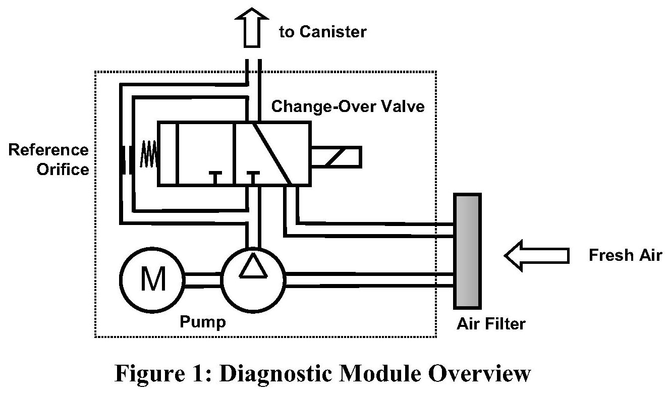 The DM-TL (Diagnostic Module Tank Leakage) is used for monitoring the evaporative system for small (> 0.02 in) and rough (> 0.04 in) leaks. It consists of an electrically driven air pump, a change-over valve and a 0.02 inch orifice for reference measurement - see Fig. 1. The tightness of the tank system is obtained by comparing the actual air pump's motor current with that measured when the system is operated with a standardized reference orifice.