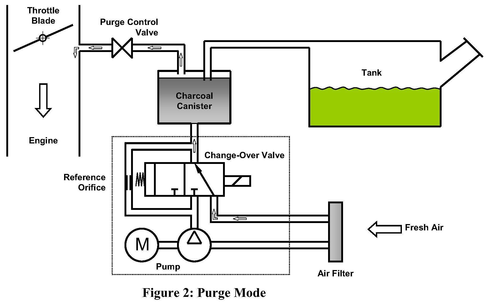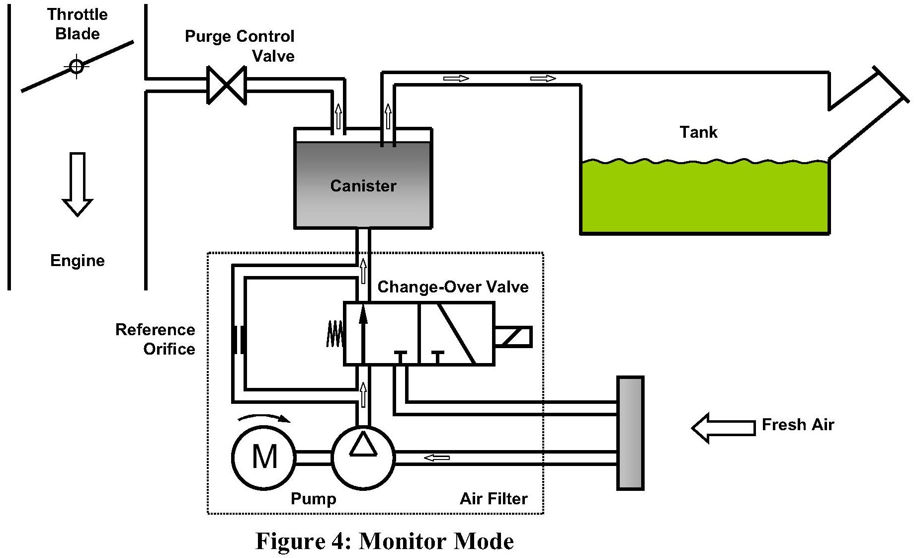 In the Monitoring Mode (Fig. 4) the change-over valve is switched on while the purge control valve remains closed. The motor current drops to a zero-load level. Fresh air is now pumped through the charcoal canister into the tank. A small overpressure, indicated by an increase in the motor current, builds up if the evaporative system is tight.