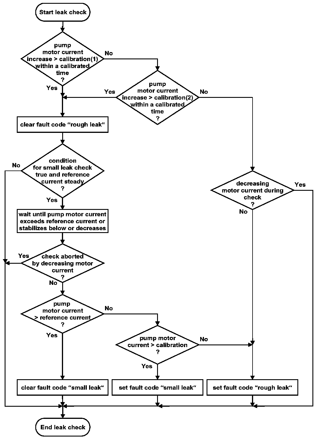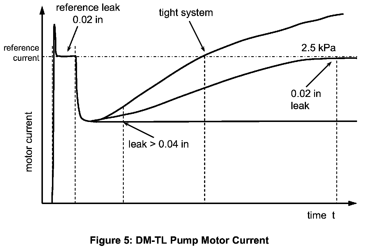 The small leak check is performed if and only if the rough leak check has been performed and no rough leak was detected. If the enable conditions for the small leak check (> 0.02 in) are fulfilled, the pump's motor remains in the active state (monitoring mode) until its current exceeds the reference current, or the motor current gradient is close to zero (current stabilizes below the reference current). If the motor current exceeds the reference current, the evaporative system is considered as tight. A small leak is assumed only if a second small leak check confirms a current stabilization below the reference current. If the motor's current decreases during one of the checks, the check is aborted. If the number of subsequent unsteady current events exceeds a calibrated value the fault code "module error" is set. Fig. 5 shows typical pump motor current characteristics.