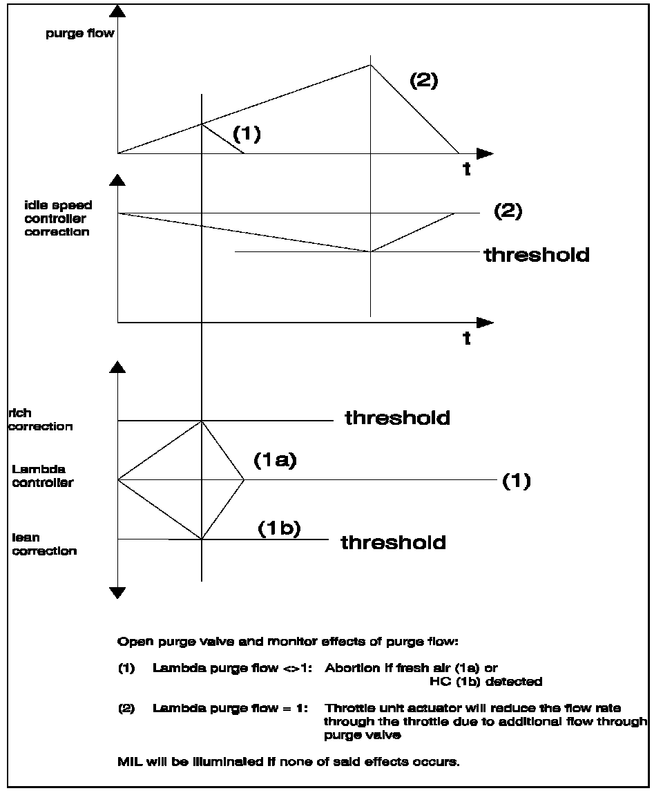 If mixture compensation or reduction of the airflow through the throttle unit does not occur for two diagnosis cycles, then a defective EVAP Purge Valve is assumed and the MIL is illuminated.