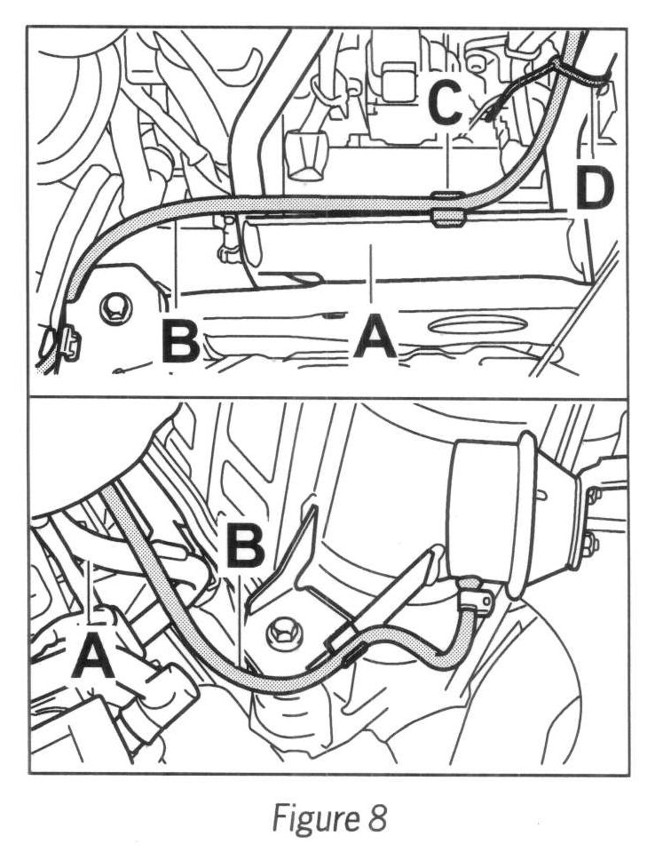 3.6 Clip hose (999.181.295.40; --> Figure 8-B-) into the hose clip (999.591.746.02; --> Figure 8-C-) and secure it to the rear muffler holder at the engine side using a tie-wrap (--> Figure 8 -D-).