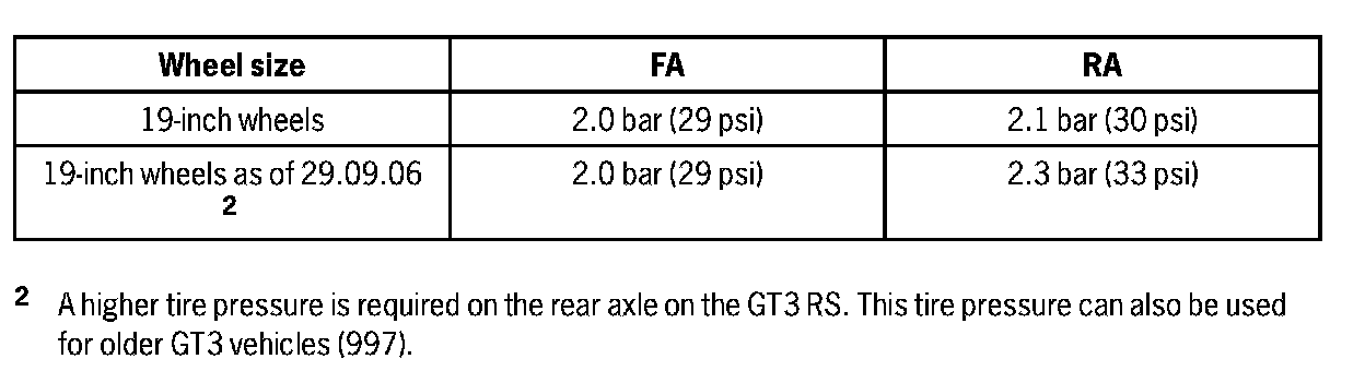 The tire pressure applies only to the tire makes and types approved by Porsche, and is specified for cold tires (approx. 68° F/20°C. The tire pressures must never be lower than the specified values.