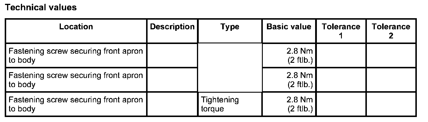 1. Tighten fastening screws -1- at the sides of the front apron -2-. Tightening torque: 2.8 Nm (2 ftlb.)
