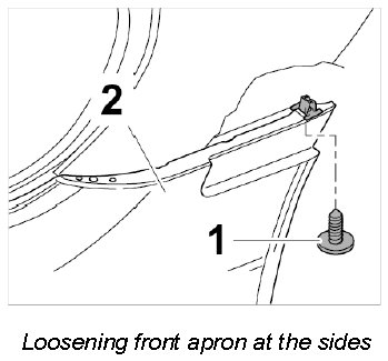 1. Unscrew fastening screws -1- at the sides of the front apron -2-.