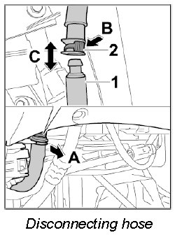 2. Release the hose -1- by pressing in the lock -2- (-arrow B-) and disconnect it -arrow C-.