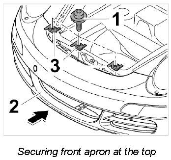 3. Position the front apron -2- on the body at the front.