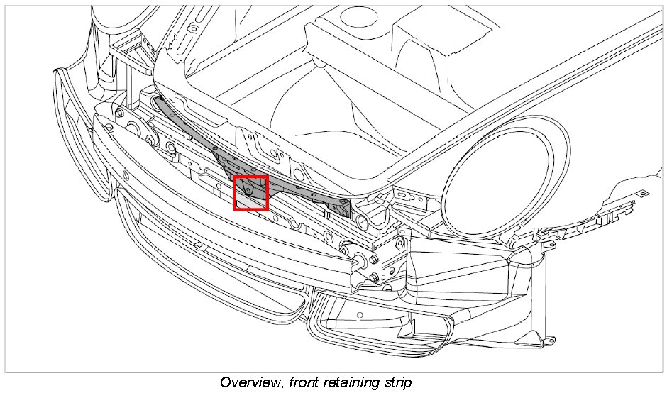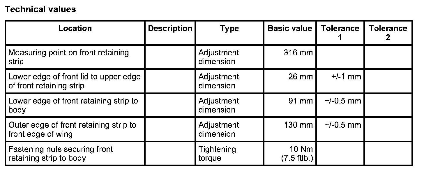 - In order to reduce adjustment work to a minimum when assembling the front spoiler, the front retaining strip must be aligned with the lower edge of the lid according to the dimensions shown.