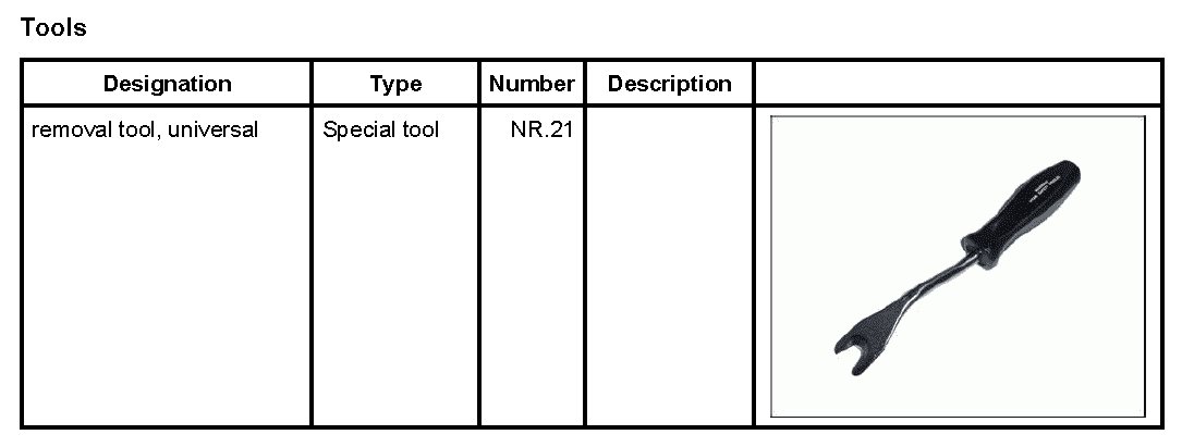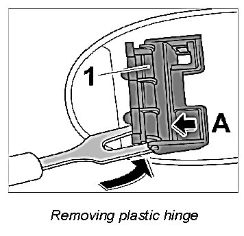 1. Insert the removal tool, universal NR.21 at the locking lugs on the left and right and lift via the locking lugs, remove the plastic hinge -1- in -direction of arrow A- from the filler flap.