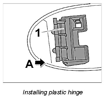 1. Position the plastic hinge -1- at the filler flap and push on in -direction of arrow A-. The lugs must engage perceptively.