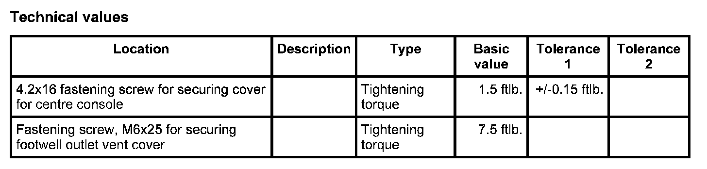 1. Position cover for centre console -2- and screw down using the fastening screws -1-. Tightening torque: 1.5 ftlb. ± 0.15 ftlb.
