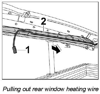 2. Pull rear window heating wire -1- out of the guide for fabric lining -2- in -direction of arrow-.