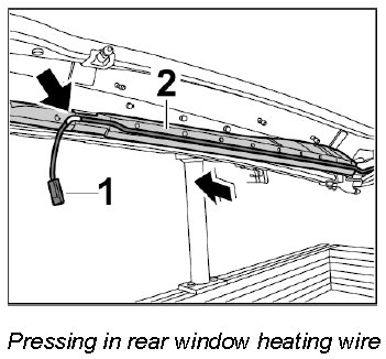 1. Press rear window heating wire -1- into the guide for fabric lining -2- in -direction of arrow-. Start at the white marking -arrow- on the wire when pressing in the rear window heating wire -1-.
