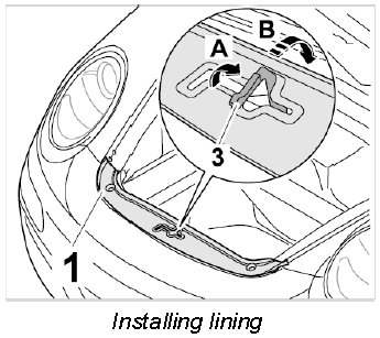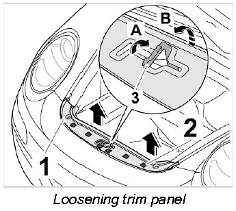 3. Actuate lid-release lever -3- in -direction of arrow A- and fit trim panel for lock support -1- (-arrow B-).