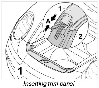 2. Insert trim panel for lock support -1- sideways into the cover for the wing flange -2- (-arrows A-).