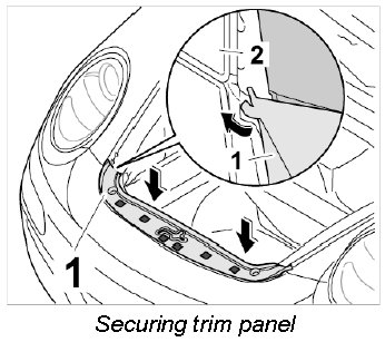 5. Slide trim panel for lock support -1- with the soft lip under the luggage compartment seal and press on Velcro fasteners.