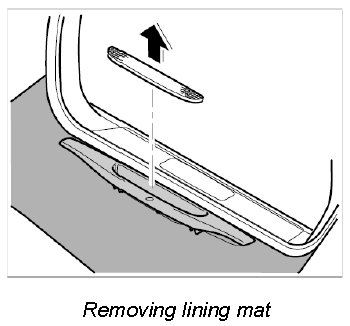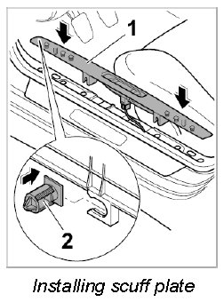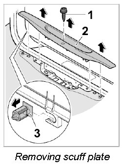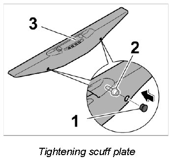 1. Remove plastic caps -1- and loosen the fastening screws -2- of scuff plate -3-.