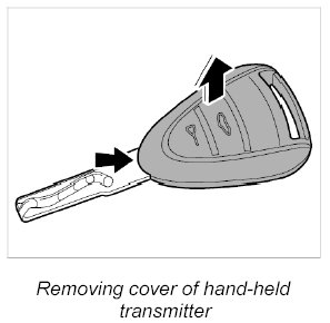 1. Insert a small screwdriver between the cover and the bottom part of the hand-held transmitter -arrow- and carefully lift off the cover.