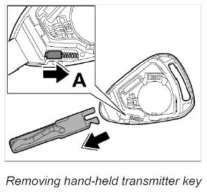 1. Push the sliding latch back using a small screwdriver -arrow A- and pull the key out of the bottom part.
