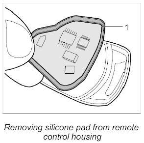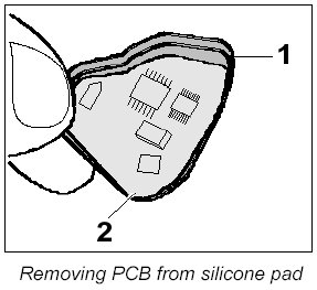 2. Remove silicone pad -1- with PCB from the remote control housing.