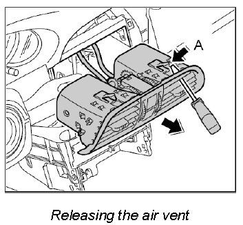 1. With a screwdriver through the top air slot, release the left and right retaining clip -A- and pull the air vent out of the dashboard.