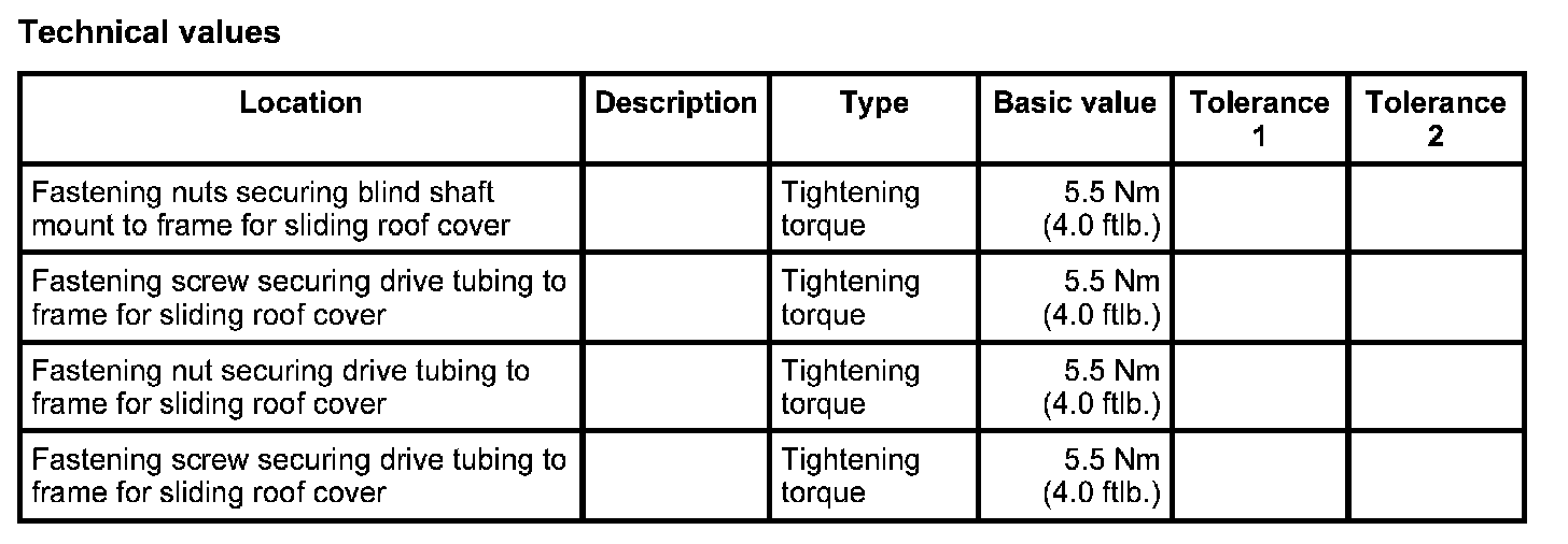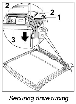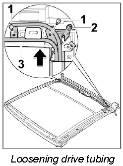 6. Insert drive tubing -3- at the left and right into the frame for the sliding roof cover in -direction of arrow- and secure with the fastening screws -2- and fastening nuts -1-. Tightening torque: 5.5 Nm (4.0 ftlb.), Tightening torque: 5.5 Nm (4.0 ftlb.).