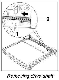 4. Pull drive shaft -1- at the left and right in -direction of arrow- to remove it from the frame for the sliding roof cover -2-.
