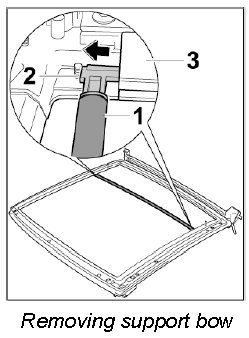 5. Pull support bow -1- and bracket -2- out of the frame for the sliding roof cover -3- in -direction of arrow-.