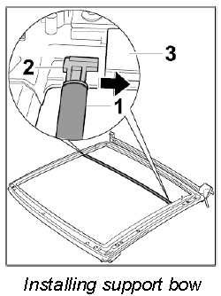 3. Fit support bow -1- and bracket -2- into the frame for the sliding roof cover -3- in -direction of arrow-.