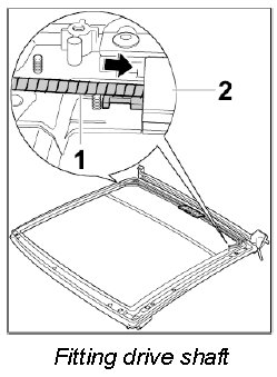 4. Insert drive shaft -1- at the left and right in -direction of arrow- to fit it into the frame for the sliding roof cover -2-.