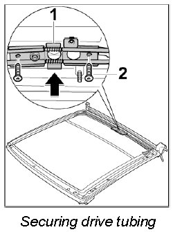 7. Position drive tubing -1- in -direction of arrow- and secure with the fastening screws -2-. Tightening torque: 5.5 Nm (4.0 ftlb.)