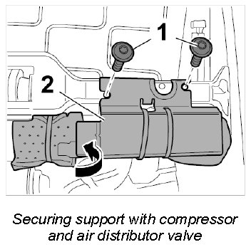 4. Position support -2- with connected motor and air cushion control valve and screw down with the two fastening screws -1-.