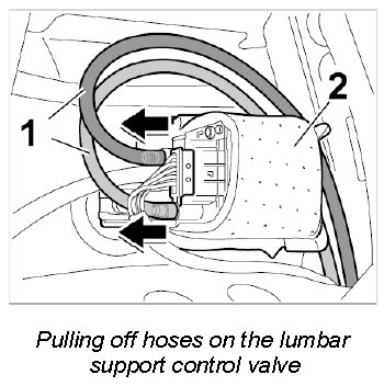 1. Pull off the red and blue hose -1- on the lumbar support control valve -2-.