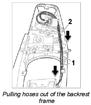2. Pull the red and blue hose -1- out of the backrest frame -2-.