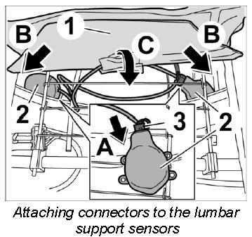 3.2. Push the two sensors -2- behind the backrest panel -arrows B- and fold down the lumbar support -1- (-arrow C-).
