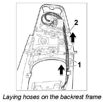 4. Lay the red hose and the blue hose -1- on the backrest frame -2-.