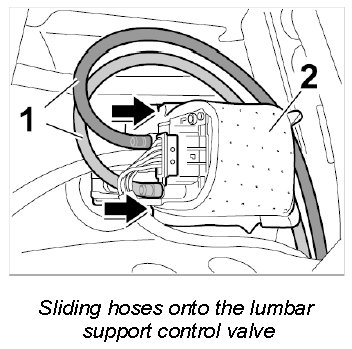 5. Slide the red and blue hose -1- onto the lumbar support control valve -2-.