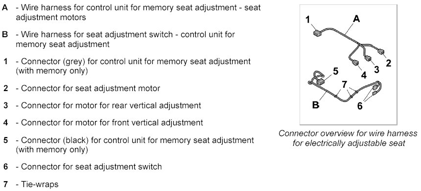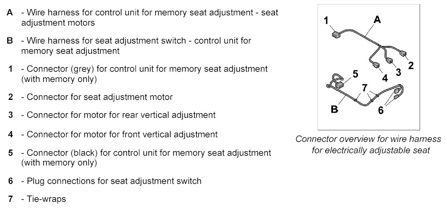INFORMATION: This description covers the two-piece wire harness for an electrically adjustable seat with memory. Some plug connections will not be present on a single-piece wire harness without memory.